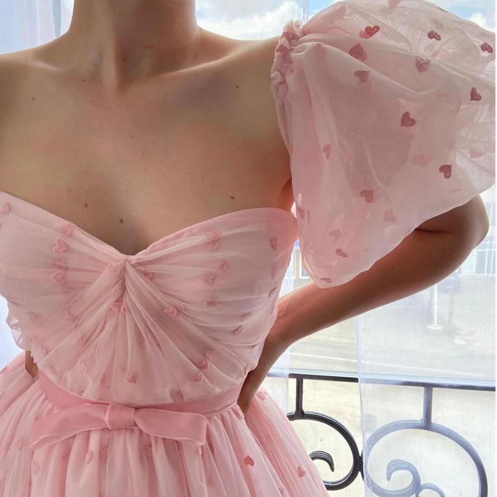 Step into a world where fashion meets fairy tale with our Pink Heart Tulle A-Line Prom Dress. Crafted with love and attention to detail, this dress is designed to make you the centerpiece of any event. Whether it’s a prom, wedding party, or a special birthday celebration, this dress ensures you look stunningly unforgettable. Its sweetheart neckline, short puff sleeves, and delicate A-line silhouette come together to create a look that’s both timeless and captivating.